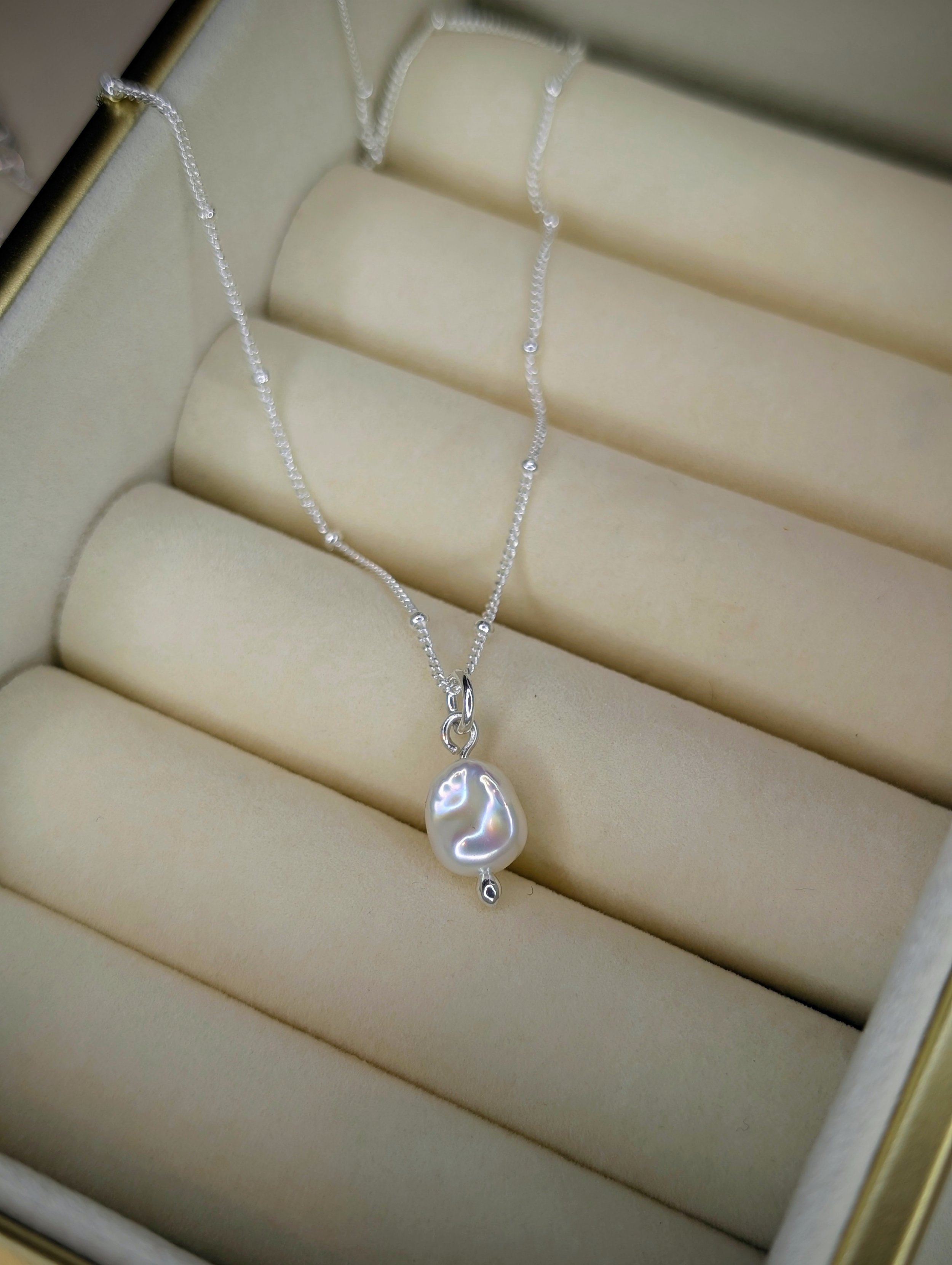 The pearl is suspended from an 18" sterling silver satellite chain, offering a delicate yet striking contrast. Your new necklace will come presented in an FSC certified eco-conscious branded jewellery box.